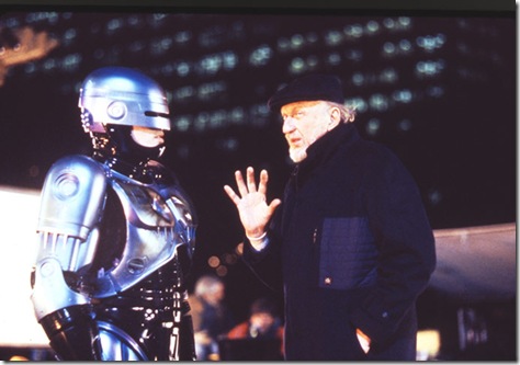 1990: Kershner, rechts, und Peter Weller als RoboCop während der Dreharbeiten zu „RoboCop 2“.